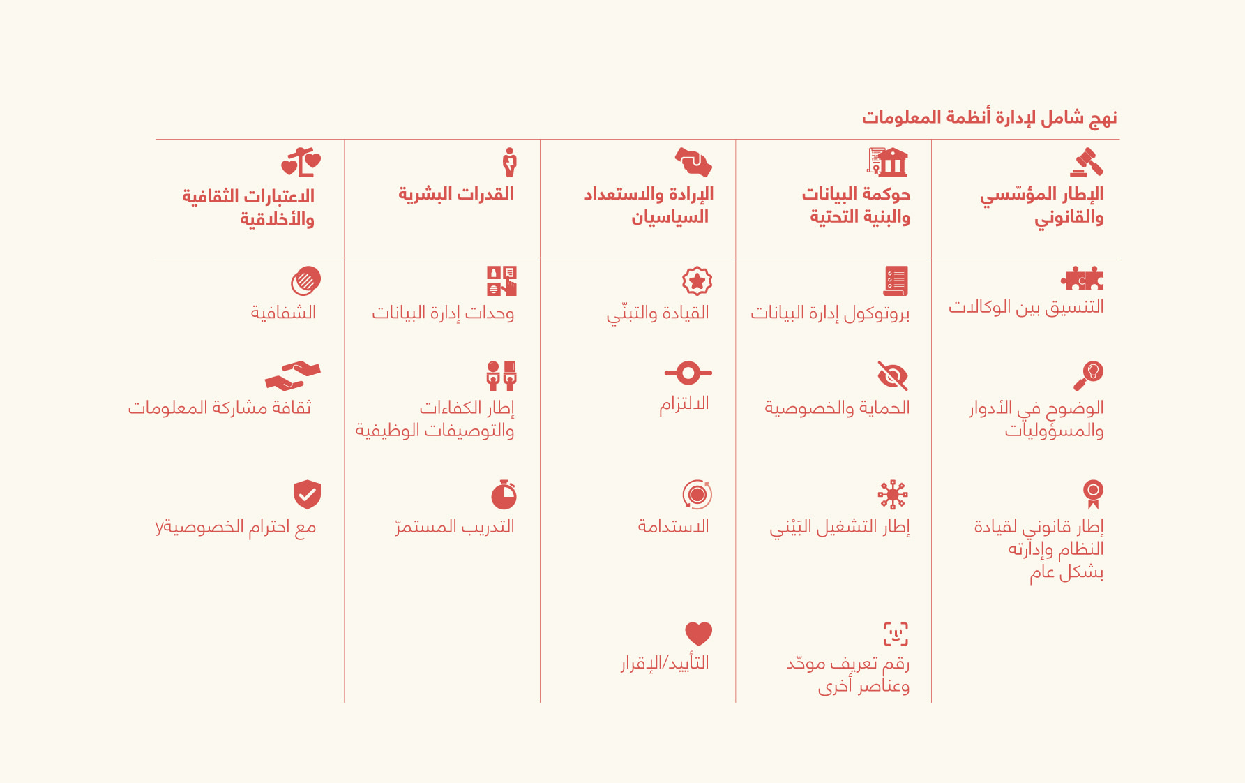 يُنظَر بشكل متزايد إلى إدارة أنظمة المعلومات والبيانات على أنَّها وظيفة تُضاهي إدارة الموارد المالية والبشرية في سياق التدخّلات العامّة. ويُعزى هذا التحوُّل إلى الاعتماد المتزايد على الإدارة الفعّالة للبيانات المملوكة للدولة واستخدامها لضمان تقديم خدمات ذات جودة عالية. وكما هو الحال في الوظيفتَيْن المذكورتَيْن أعلاه، يستلزم هذا الأمر بطبيعته إنشاء نظام حوكمة شامل ومُحكَم. يجب أن يُحدِّد هذا النظام السياسات والإجراءات والمعايير، وأن يكفل تنفيذها لضمان الإدارة الفعّالة للبيانات، وحُسن استخدامها وحمايتها، بما في ذلك جوانب الحماية والأمن، والامتثال التنظيمي، والتشغيل البَيْني، والجودة والدقّة، والملكية، وبروتوكولات الوصول. والأهمّ من ذلك أنَّ هذا النظام يُسهِم في إحداث تحوُّل ثقافي على صعيد الجهات الحكومية.