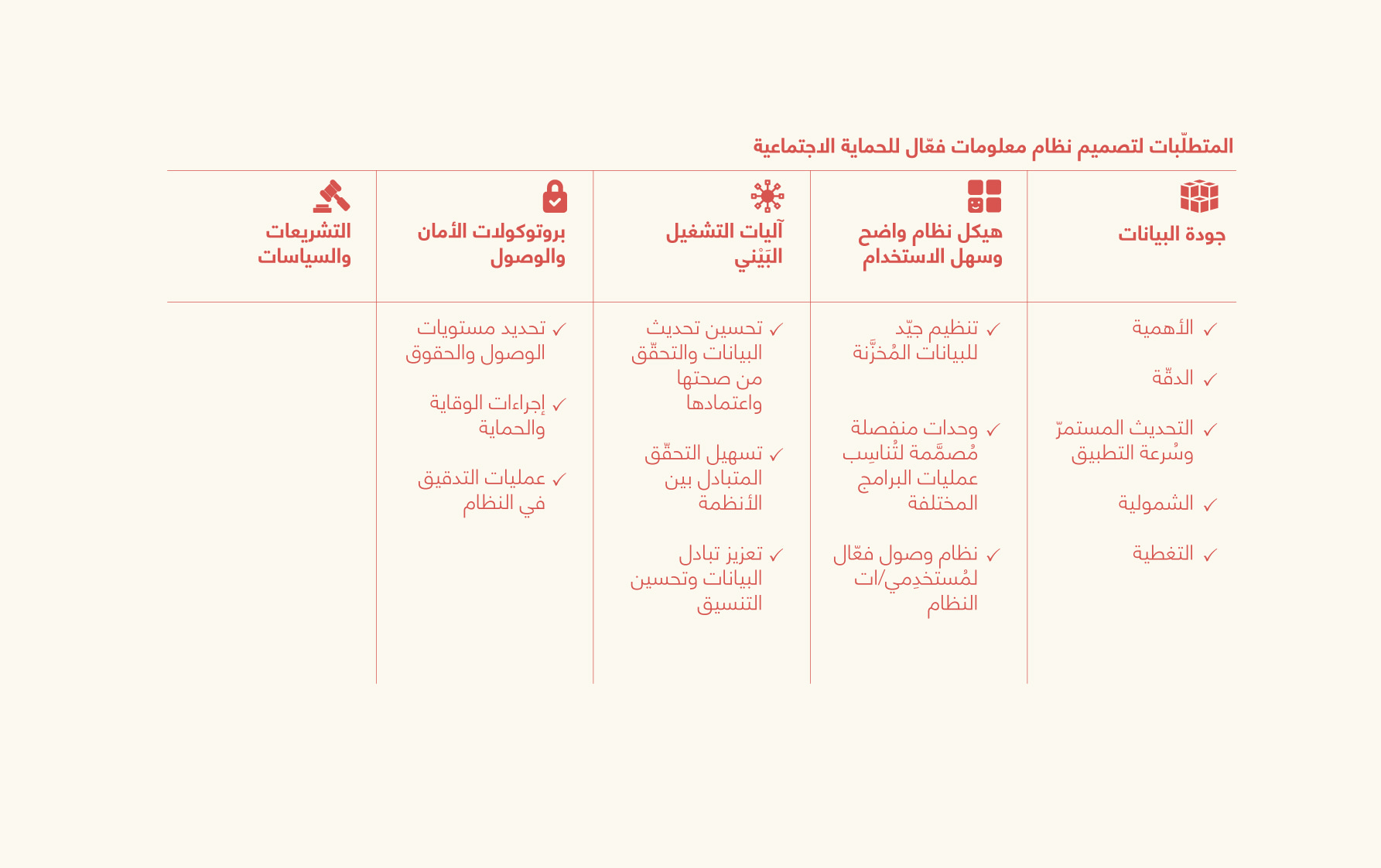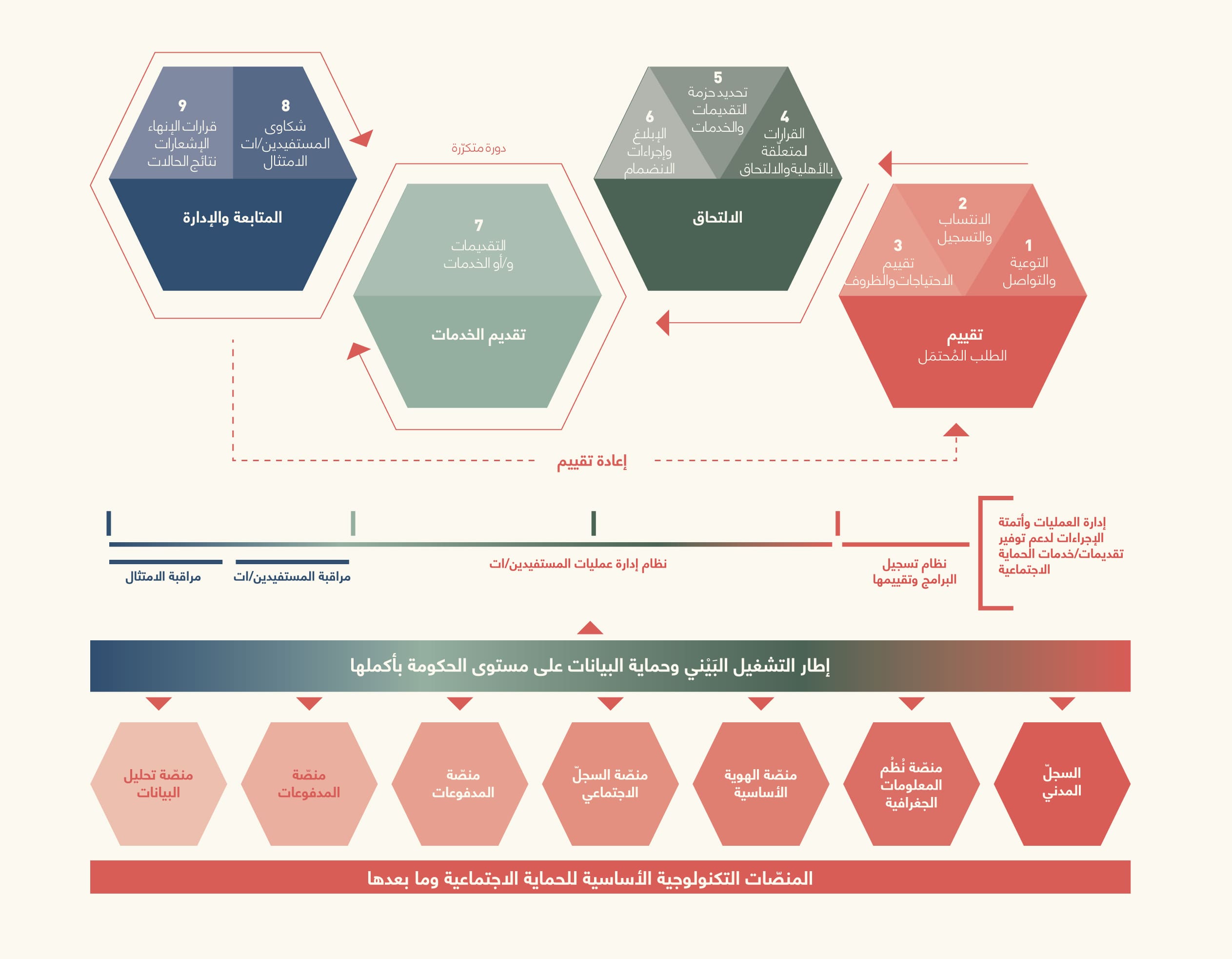 في الممارسة العملية، يعتمد نجاح أيّ نظام حماية اجتماعية على قدرته في تحديد المستفيدين/ات بدقّة، وضمان تسجيلهم/نّ بسلاسة، وتقديم الدعم الكافي، والتكيُّف مع الاحتياجات المتطوّرة، والحفاظ على آلية مراقبة فعّالة. ويتطلّب ذلك تنفيذ نظام بيانات يعمل في الوقت الفعلي، بحيث يُسهِّل تبادل المعلومات من خلال تكامل الوظائف الأساسية ضمن سلسلة تقديم خدمات الحماية الاجتماعية. كذلك، يُعَدّ التشغيل البَيْني مع الأنظمة الحكومية الأخرى ضروريًا لتحقيق وفورات الحجم والنطاق (شيرشير وباركا، ٢٠٢٠).