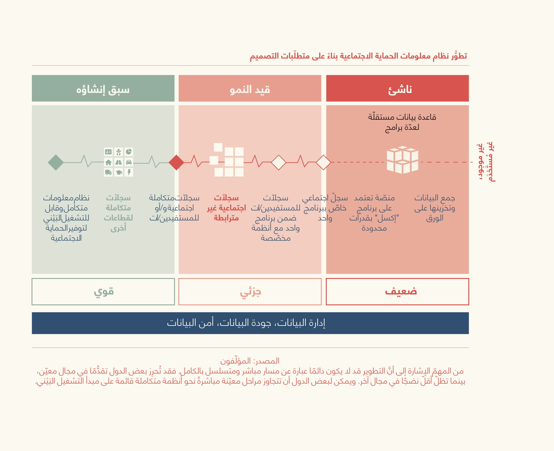 المرجع: جورج وليتي (George & Leite)، أنظمة المعلومات الاجتماعية المتكاملة والسجلّات الاجتماعية (Integrated Social Information Systems and Social Registries، ٢٠١٩، بتصرّف).