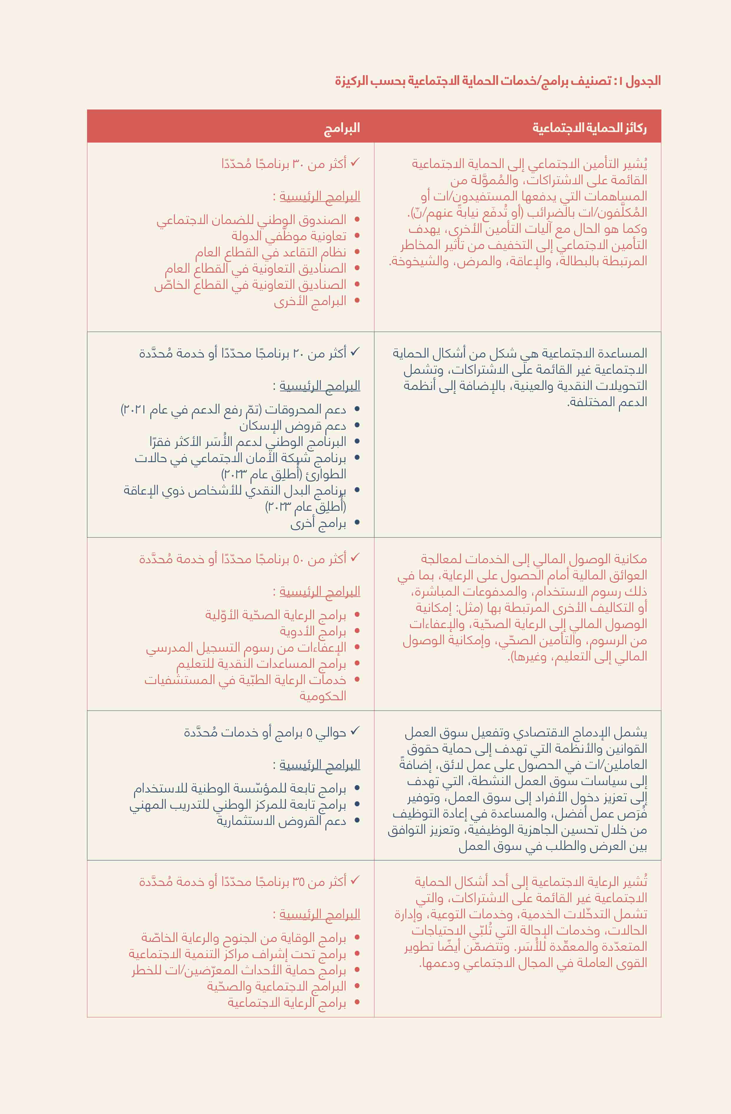 الجدول ١: تصنيف برامج/خدمات الحماية الاجتماعية بحسب الركيزة
